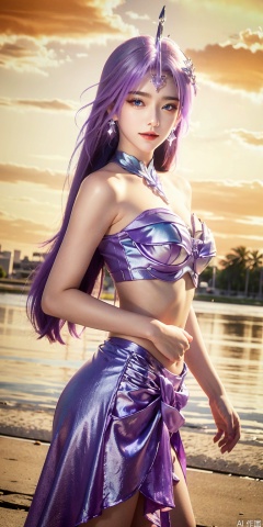 1girl, solo, long hair, , looking at viewer, skirt, hair ornament, bare shoulders, jewelry, , black hair, earrings, outdoors, midriff, water, necklace, lips, crop top, grey eyes, leaning forward, ocean, white skirt, strapless vest, sunset, sun,yueliu,purple hair,blue eyes