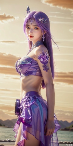 1girl, solo, long hair, , looking at viewer, skirt, hair ornament, bare shoulders, jewelry, , black hair, earrings, outdoors, midriff, water, necklace, lips, crop top, grey eyes, leaning forward, ocean, white skirt, strapless vest, sunset, sun,yueliu,purple hair,blue eyes