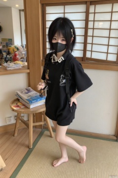 1girl,solo,short hair,looking at viewer,bangs,shirt,black hair,bow,standing,shirt,short sleeves,barefoot,smile,nice foot,indoors,black eyes,cosplay,bare legs,wariza,tatami,a 15-year-old Japanese girl with light makeup,midriff,SFW,black mask,huochi