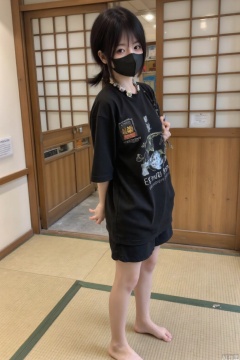 1girl,solo,short hair,looking aside,from side,bangs,shirt,black hair,bow,standing,shirt,short sleeves,barefoot,smile,nice foot,indoors,black eyes,cosplay,bare legs,wariza,tatami,a 15-year-old Japanese girl with light makeup,midriff,SFW,black mask,huochi,short ponytail