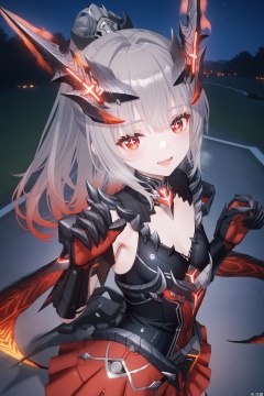 1girl,nanami,loli, solo, long hair, breasts,ponytail,horns, looking at viewer, bangs, skirt, red eyes, thighhighs, gloves, grey hair, armor, red skirt, headgear, mecha musume,paw pose,upper body,nanami,outdoors,night,cross shaped pupils,from above,naughty smile,cute,open mouth,masterpiece,best quality,((artist:reoen),(artist:fuzichoco),(artist:atdan),(artist:torino_aqua:0.5),year 2024:0.5),(artist:omone_hokoma_agm:0.8),jijia, 2d, anime,
