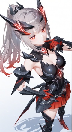 1girl,nanami, solo, long hair,horns,cross shaped pupils,ponytail,breasts, bangs, skirt, red eyes, thighhighs, gloves, grey hair, armor, gradient, red skirt, headgear, mecha musume,boots,armored boots,smug,grin,from above,