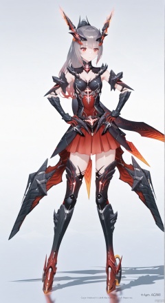 1girl,nanami, solo, long hair,horns,cross shaped pupils,ponytail,breasts, bangs, skirt, red eyes, thighhighs, gloves, grey hair, armor, gradient, red skirt, headgear, mecha musume,boots,armored boots,hands on hips,full body,