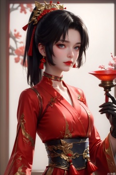score_9, score_8_up, score_7_up,highly detailed digital,CG,1girl, solo, looking at viewer, black hair, hair ornament, long sleeves, jewelry, closed mouth,ponytail,choker, red lips,portrait (object), chinese clothes,  sash, red dress, gloves,