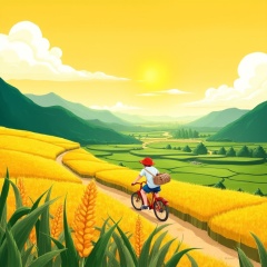 misc,A digital illustration of a boy riding a bicycle through a golden wheat field at sunset. The boy is wearing a red hat, a white shirt, and blue shorts, and has a basket on his back. The background features a lush green valley with rolling hills and distant mountains, under a bright yellow sky with fluffy white clouds. The scene is vibrant and colorful, with a sense of adventure and peacefulness.<lora:米洛包装插画-L1.4:1>