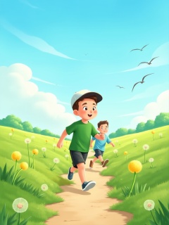 misc,A digital painting of two young boys running on a path through a lush green field with dandelions and daisies. The boy in the foreground is wearing a green t-shirt, black shorts, and a white cap, and has a determined expression on his face. The background features a bright blue sky with fluffy white clouds and a few birds flying in the distance. The scene is vibrant and cheerful, with a soft, pastel color palette. The boys are positioned in the center of the image, with the path leading away from them.<lora:米洛包装插画-L1.4:1>