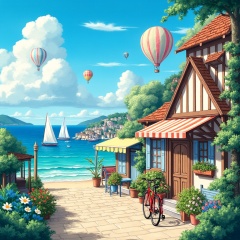 misc,A vibrant, detailed digital painting of a picturesque coastal village with a bright blue sky, fluffy white clouds, and a serene ocean in the background. The village is filled with quaint wooden buildings with colorful striped awnings and potted plants, a bicycle parked on the cobblestone path leading to one of them, and several sailboats in the distance. Two hot air balloons are flying over the village, adding a whimsical touch to the scene. The colors are bright and cheerful, with a mix of blues, greens, and yellows. The atmosphere is peaceful and idyllic, with the sun shining down on the village and the sea. <lora:米洛包装插画-L1.4:1>