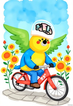 DCET, A quirky, watercolor children's illustration of a parrot riding a bicycle. The parrot has bright, multicolored feathers and a mischievous grin, and is wearing a tiny helmet. It pedals along a cobblestone path, with flowers blooming alongside. The background is a cheerful blue, like a summer sky. The parrot has a confident expression, wings flapping to keep balance. The drawing is full of whimsy and adventure.