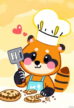 DCET, A playful, watercolor children's sketch of a raccoon baking cookies. The raccoon has a striped gray and black fur and dexterous paws, and is wearing a chef's hat and apron. It stands in a cozy kitchen with flour dusting its nose. The background is a warm yellow, like the glow of an oven. The raccoon has a cheerful expression, a cookie in one paw and a spatula in the other. The drawing is full of fun and baking adventures.