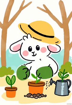 DCET, A gentle, watercolor children's sketch of a lamb gardening. The lamb has a soft, white fleece and innocent eyes, and is wearing a sunhat and gardening gloves. It tends to a small plot of vegetables, with a watering can in hand. The background is a fresh green, like a lush garden. The lamb has a content expression, carefully nurturing each plant. The drawing evokes a sense of peace and growth.