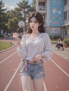 The noon sunlight shines between the sycamore tree crowns above the playground, forming mottled spots on the characters - the white sweatshirt is illuminated into a warm gold color, the blue of the denim skirt appears deep in the shadow, the light and shadow on the face are soft and even, and sweat reflects tiny spots of light on the forehead and neck. The red track lines at her feet are clear, the basketball rack and horizontal bars in the distance cast long shadows in the sun, the walls of the teaching building in the background are painted with light blue latex paint, and several pots of green plants are placed on the windowsill, and the leaves are gently shaking in the wind. The fragrance of grass and the faint smell of the plastic track floated in the air. The cheers of juniors and the "bang" sound of basketball hitting the ground came from a distance, creating a campus scene full of youthful atmosphere, as if it was a "living picture without dead corners" captured by idols when they participated in campus activities.