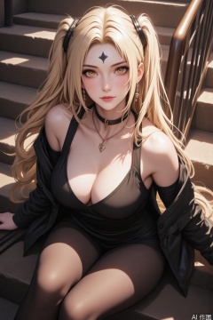 lvjing, Blonde hair, long hair, twin tails, eyebrow scars, yellow eyes, fair skin, breasts, stairs, solo, pantyhose, sitting, high heels, cleavage, jewelry, black shoes, jacket, earrings, large breasts, watching the audience, black jacket, open top jacket, dress, collarbone, open top clothes, black dress, black pantyhose