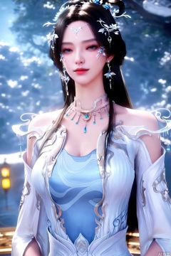 1girl, solo, long hair, looking at viewer, black hair, hair ornament, dress, jewelry, upper body, necklace, white dress, blue dress