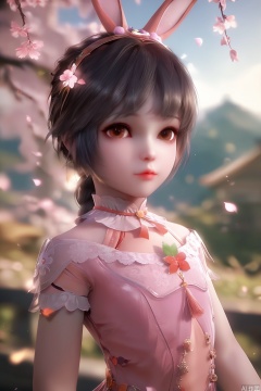 score_9,score_8_up,score_7_up,1girl,solo,looking at viewer,short hair,black hair,dress,animal ears,brown eyes,jewelry,rabbit ears,lips,pink dress,long braid,hime cut,Child,blurry background,petals,Cherry Blossoms