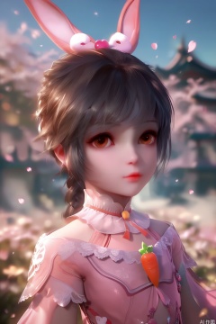 score_9,score_8_up,score_7_up,1girl,solo,looking at viewer,short hair,black hair,dress,animal ears,brown eyes,jewelry,rabbit ears,lips,pink dress,long braid,hime cut,Child,blurry background,petals,Cherry Blossoms,carrot