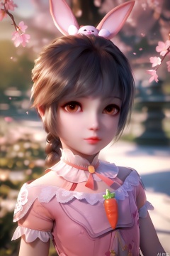score_9,score_8_up,score_7_up,1girl,solo,looking at viewer,short hair,black hair,dress,animal ears,brown eyes,jewelry,rabbit ears,lips,pink dress,long braid,hime cut,Child,blurry background,petals,Cherry Blossoms,carrot