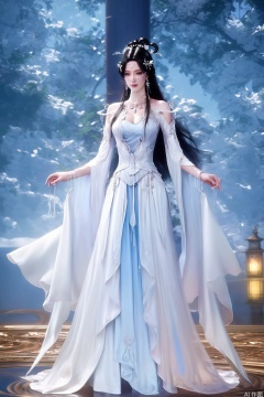 1girl, solo, long hair, blue eyes, black hair, hair ornament, veil,standing, full body, white dress