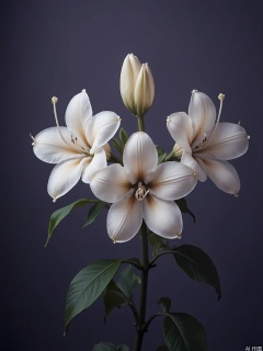 XHYS, Photograph of a group of five pure white lilies with long, trumpet-shaped blossoms, set against a deep purple background. The lilies are at different stages of bloom, some still in bud form. Their leaves are a glossy, dark green, creating a striking contrast. The lighting is soft, casting a halo around the lilies and enhancing their purity. The overall mood is peaceful and spiritual, focusing on the flowers' serene beauty.