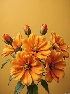 XHYS, Photograph of a cluster of eight bright orange marigolds with daisy-like petals, captured against a bright yellow background. The marigolds are in various stages of bloom, some fully opened and others still budding. Their leaves are a vibrant green, adding to the scene's liveliness. The lighting is warm, emphasizing the marigolds' cheerful and sunny disposition. The composition is lively and energetic, highlighting the flowers' bold colors.