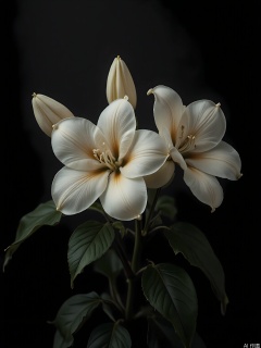 XHYS, Photograph of a bouquet of four soft white calla lilies with elegant, trumpet-shaped blossoms, set against a black background. The calla lilies are in various stages of bloom, some just beginning to open. Their leaves are a rich, emerald green, adding depth to the scene. The lighting is dramatic, casting deep shadows that accentuate the calla lilies' pure and sophisticated beauty. The composition is striking and serene, focusing on the flowers' graceful forms.