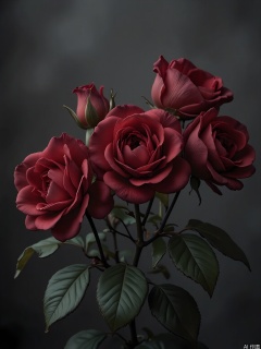 XHYS, Photograph of a cluster of seven deep red roses with velvety petals, photographed against a dark gray background. The roses are in various stages of bloom, some just starting to unfurl. Their leaves are a glossy, dark green, providing a striking contrast. The lighting is soft, casting a romantic glow that enhances the roses' passionate nature. The composition is elegant and serene, focusing on the flowers' intricate details.