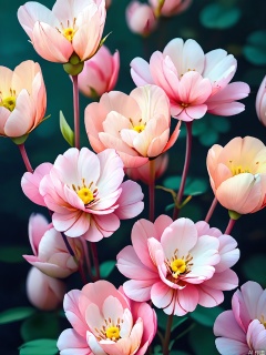 XHYS, Photograph of a bunch of seven soft peach peonies with ruffled petals, photographed against a light pink backdrop. The peonies are in various stages of bloom, from tight buds to fully opened flowers. Their leaves are a deep, forest green, providing a warm contrast. The lighting is gentle, highlighting the peonies' romantic and delicate nature. The composition is romantic and inviting, capturing the flowers' lush textures.