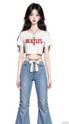 (fully body:1.4),masterpiece,best quality,high detail,(gigantic_breasts:1.6), This picture is a stylized illustration depicting a long haired woman wearing black earrings and a white off shoulder t-shirt. The pattern design of this T-shirt features the red word BEATLES. This person is also wearing a pair of blue multi pocket jeans tied around the waist with a white ribbon, with worn pockets and edges. The silhouette of the pants is trumpet shaped, with a simple and modern illustration style that emphasizes fashion and style.
