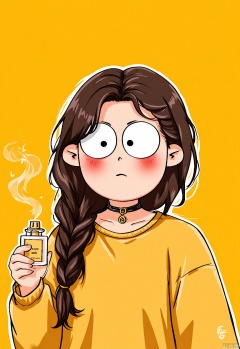 QMKT, Digital drawing of a young woman with long, braided brown hair, holding a small perfume bottle in her right hand, emitting a puff of smoke. She has a concerned expression with wide eyes and flushed cheeks. She is wearing a yellow shirt and a black choker. The background is a solid yellow color. The style is cartoonish with thick outlines and simple shading.