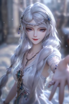 score_9,score_8_up,score_7_up,1girl,solo,looking at viewer,long hair,dress,hair ornament,jewelry,necklace,very long hair,braid,white hair,necklace,white dress,bracelet,blurry background,smile,reaching_out,portrait,pov,A clear hand