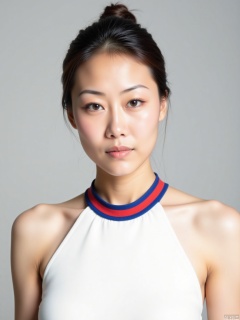 A serene portrait of a young woman: a canvas of porcelain skin, dark hair tied back in a sleek silhouette, against a neutral studio backdrop. Her white top features bold red and blue stripes on the collar, drawing attention to her radiant complexion. She stands center-framed, sans distractions, inviting contemplation.