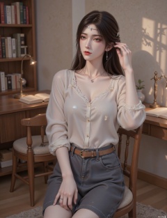 26-year-old East Asian woman, cold white skin with natural texture. Long black hair with low-coated hair, two slightly curly hair hanging on the ears, and silver hairpins (hammer forged texture) fixed. Makeup: Wild eyebrows, inner eyeliner, bean paste lips, cinnamon-colored contouring and gently sweep the cheekbones. Sitting upright with a wooden chair, leaning forward slightly, wearing a chair arm with the right hand (wearing a star-patterned silver ring), touching the hem of the skirt with the left hand, looking gentle and sideways, and the neck and shoulder lines are elegant.