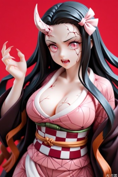 1girl,solo,kamado nezuko,long hair,cracked skin,breasts,veins,horns,slit pupils,cleavage,black hair,single horn,japanese clothes,sharp fingernails,kimono,fingernails,looking at viewer,red background,sash,teeth,obi,open mouth,large breasts,ribbon,very long hair,pink kimono,multicolored hair,hair ribbon,pink eyes,simple background,