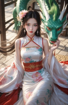 score_9,score_8_up,score_7_up,break.,1girl,solo,pov,china outfit,looking at viewer,style by nm, 1girl, dragon, golden and green \(nm style\), hair ornament, eastern dragon, flower, depth of field, solo, lips, dress, hair flower, red lips, floral print,1girl,solo,long hair,blush,