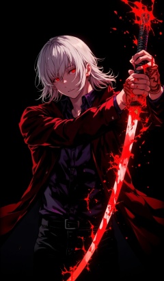 , Colorful Crazy Colors particle crushing effect ccccci black hair, fate (series), red eyes, 1boy, fate/grand order, weapon, male focus, black coat, holding, blood, coat, sword, blood on clothes, solo, glowing, sfw, black background, holding sword, holding weapon, glowing eyes, fgo, hair between eyes, bangs, white hair, long sleeves, looking at viewer, long hair, black sword, glowing sword, holding weapon over shoulder, male focus