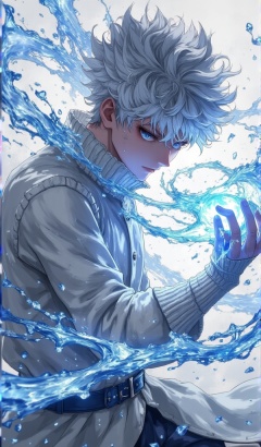 Confident 18-year-old boy with silver hair, white sweater, detailed painting of fighting posture (ice magic), blowing cold wind from his hand
