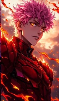 messy pink hair,orange eyes,slim,tall,short hair, red Battle Armor,fire,1 male,