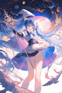 1girl, solo, heterochromia, blue_hair, long_hair, blue_eyes, holding, hat, witch_hat, smile, twintails, yellow_eyes, gloves, star_\(symbol\), fur_trim, bird, very_long_hair, capelet, looking_at_viewer, white_background, bow, staff, wand, skirt, simple_background, open_mouth, hair_ornament, blush, blue_bow, >_<, crescent, :d, holding_wand, holding_staff