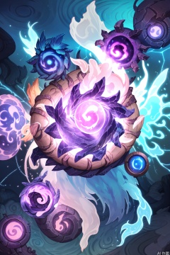 The image depicts a fantastical cosmic scene with a swirling nebula in the background, featuring vibrant shades of purple, blue, and pink. At the center of the image is a large, abstract creature resembling a tentacled entity with an eye that emits a bright, glowing light. The creature's body is composed of flowing, ribbon-like shapes that give it an ethereal appearance. Surrounding the creature are smaller, glowing orbs and lightning bolts, adding to the dynamic and mystical atmosphere. In the foreground, there are two planets, one with swirling colors and the other with a more solid, blue hue, both set against a backdrop of stars and cosmic clouds. The overall composition is vibrant and otherworldly, evoking a sense of wonder and mystery.HearthStone,card back
