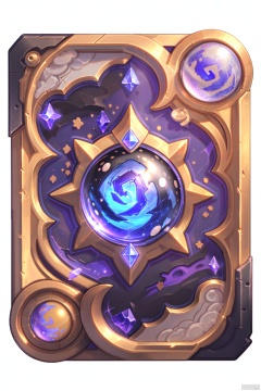 The image depicts a small, spherical object with a glossy, iridescent surface. The sphere is predominantly purple, with a gradient that transitions from a darker shade at the top to a lighter one towards the bottom. There are several small, star-like shapes scattered across the surface, each consisting of a yellow star and a smaller, triangular shape. The background is completely black, which makes the purple sphere stand out prominently. The overall appearance suggests a stylized, possibly digital or artistic representation of a celestial object.HearthStone,card back