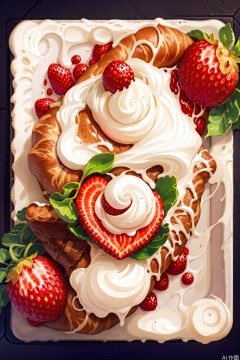 The image shows a croissant-shaped pastry on a white plate. The pastry is topped with a generous amount of whipped cream and a fresh strawberry. The whipped cream is piped in a decorative manner, and the strawberry is placed in the center, adding a pop of color. The plate is set against a plain black background, making the food the focal point of the image.HearthStone,card back