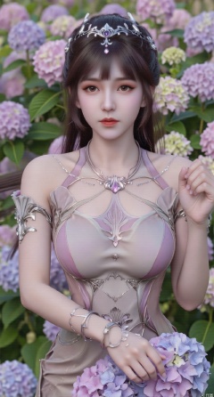 SFW,(masterpiece:1.2),best quality,absurdres,masterpiece,original,extremely detailed wallpaper,perfect lighting,1girl,solo,looking at viewer,(cowboy_shot:1.3),long hair,high heels,blurry background,depth of field,motion blur,(long dress:1.23),china_dress,chinese_style,bare shouders,crystal_earrings,headpiece,hair_tie,chest_jewel,gem,necklace,jewelry,in summer,day,outdoors,nature,garden,,(standing,Hydrangea, Hydrangea Field:1.59),(huge breasts:2.99),(full breasts:2.99),Xzhihua,Xsiyouyou,Xyanruyu,Xmoxiaonan,Xyeqingxian,Xyunwangshu,XlishaoyinY,Xxiaowu,Xyusanniang,XhuolingerHHY