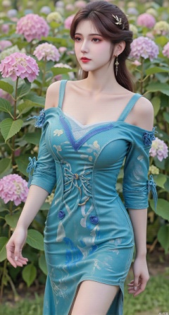 SFW,(masterpiece:1.2),best quality,absurdres,masterpiece,original,extremely detailed wallpaper,perfect lighting,1girl,solo,looking at viewer,(cowboy_shot:1.3),long hair,high heels,blurry background,depth of field,motion blur,(long dress:1.23),china_dress,chinese_style,bare shouders,crystal_earrings,headpiece,hair_tie,chest_jewel,gem,necklace,jewelry,in summer,day,outdoors,nature,garden,,(standing,Hydrangea, Hydrangea Field:1.59),(huge breasts:2.99),(full breasts:2.99),Xzhihua,Xsiyouyou,Xyanruyu,Xmoxiaonan,Xyeqingxian,Xyunwangshu,XlishaoyinY,Xxiaowu,Xyusanniang,XhuolingerHHY