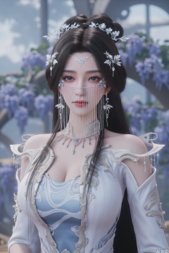 A highly detailed CGI image of a beautiful, fair-skinned woman with long, dark hair adorned with intricate, silver floral headpieces and delicate chains. She wears an elaborate, ethereal gown with a plunging neckline. Her serene expression and soft makeup enhance her ethereal beauty.