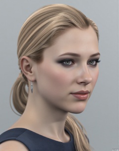 This is Chloe. She has a neatly - arranged golden ponytail with shiny hair. Her makeup is exquisite, with deep - set eyes and naturally - colored lips. There is a light - blue circular switch button on her left temple, exuding a sense of technology.,Biomimetic robot,DTL,light blue circular button,looking_at_viewer