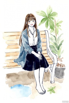 1girl, solo, long hair, smile, bangs, skirt, brown hair, shirt, black hair, long sleeves, dress, sitting, jacket, closed eyes, outdoors, barefoot, black skirt, water, leaf, blue jacket, bench,watercolor with line