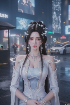 She has pale skin,backed by skyscrapers covered in holographic ads and hovering vehicles. Neon reflections ripple across wet pavement, rendered in surreal cyberpunk color grading with cinematic lighting that highlights the tension between technology and organic beauty.,large chest