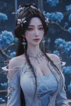 beautiful and elegant princess,full body photo,,fashion clothing,huge flowers,delicate stamen,the delicate facial features,flying petals,surrounded by flowers,dark blue atmosphere,(flowers of dark blue:1.3),(klein blue:1.3),shining fluorescence,the glowing colors of the night,crystal clear petals,many delicate aqua blue flowers,blue floodlight like the ocean,, (masterpiece:1,2), best quality, masterpiece, highres, original, extremely detailed wallpaper, perfect lighting,(extremely detailed CG:1.2ï¼,large chest,busty woman,fantasy