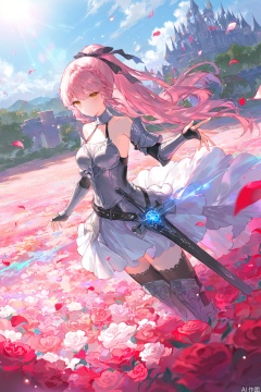(day),flowers meadows,castle,1girl, solo, pink hair, ponytail,dress, armor, sword, white dress, armored dress,dress, breasts, looking at viewer, long hair, collarbone, hair ribbon, yellow eyes, braid, detached sleeves,Roses, petals. flower,(thighhighs with rose pattern:0.8),armor_thighhighs,