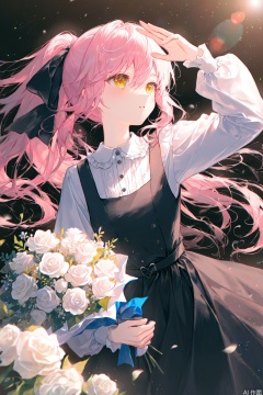 1girl,bouquet,solo,flower,holding bouquet,long hair,ponytail,holding,long sleeves,shirt,pink hair,looking up,dress,white shirt,frills,white flower,shading eyes,rose,white rose,hair bow,black dress,bow,parted lips,yellow eyes,collared shirt,ribbon,arm up,puffy long sleeves,black bow,holding flower,puffy sleeves,frilled shirt collar,buttons,hair between eyes,cowboy shot,hair ribbon,looking afar,frilled dress,standing,pinafore dress,sleeveless dress,hand up,