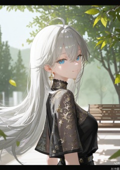 1girl, solo, long hair, breasts, looking at viewer, smile, bangs, blue eyes, shirt, hair between eyes, jewelry, closed mouth, upper body, ahoge, grey hair, earrings, outdoors, sky, day, from side, tree, black shirt, floating hair, leaf, letterboxed, wind, lens flare, bench